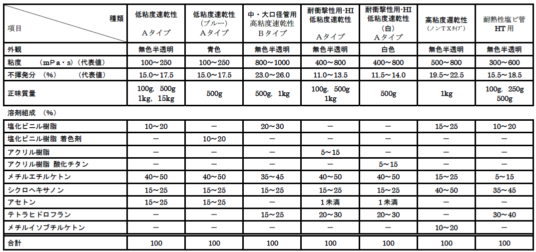 上記製品には、処方上厚生労働省VOC指針値策定物質(TVOCを除く13 物質)を配合しておりません。 ※「環境ホルモン65物質」、「ホルムアルデヒド」、「アスベスト」は配合されておりません。作成日:2014/ 1/7 備考:ノンTXタイプ…ノントルエン・ノンキシレンの略トーエー接着剤硬質塩化ビニル管用接着剤