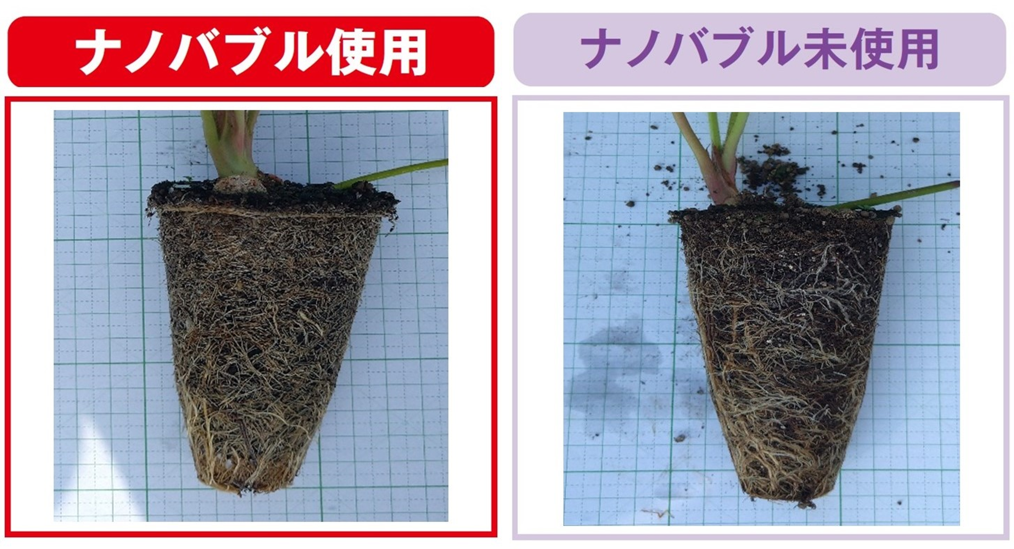 育苗初期からナノバブル水での栽培を行うことにより、側根、細根が発達し、力強くエネルギーに満ちた苗に成長します。また、耐病性も上がり、炭疽病などによるロス苗も減少します。加えて側根、細根の発達により、夏の暑さにも負けず、樹勢を保ち、しっかりと成長します。定植時には、ポット内にはぎっしりと細根が張りめぐり、クラウンは大きく、徒長せずに茎は太く、葉は厚みがあって艶がある、最高の状態に仕上げることが可能です。
