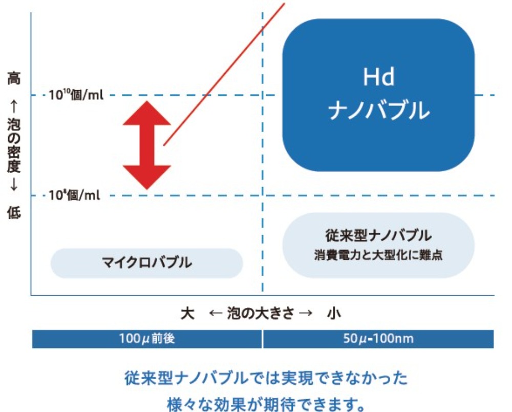 ナノバブルの中でも特に10⁹(10億)個/ml以上の密度のものを『超高密度ナノバブル』或いは「Hd-ナノバブル(Hyperdense-Nanobubble)」と呼んでます。