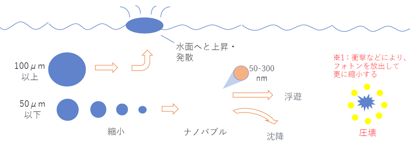 50μm以下の泡は、自らの表面張力作用により自己縮小し、1分ほどで自己圧壊、50~300nm(ナノミリメーター)の泡となります。
