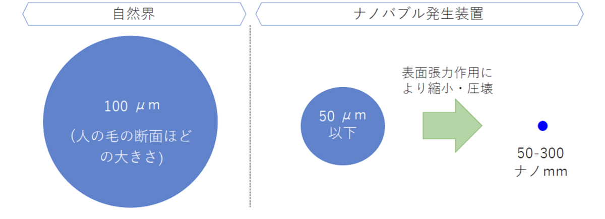 我々のいる環境で一般的に存在する水中の泡で最も小さいサイズが100μm(マイクロメーター)、髪の毛の断面ほどのサイズです。