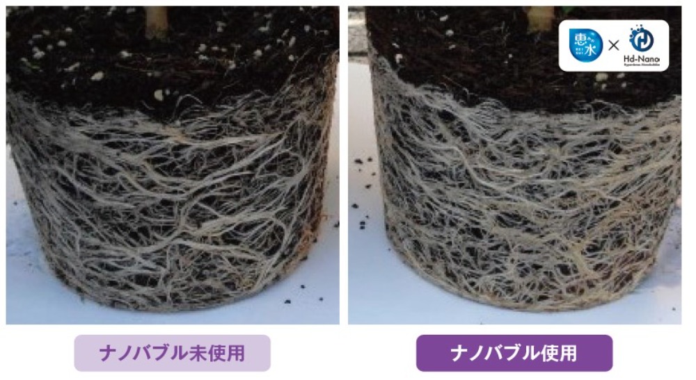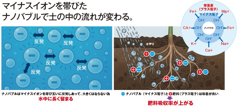 『根がしっかり張ることに加え、ナノバブルはマイナスの電子を持つことから、プラスの電子を持つ多くの肥料分と吸着し、格段に肥料吸収効率がUPします。』