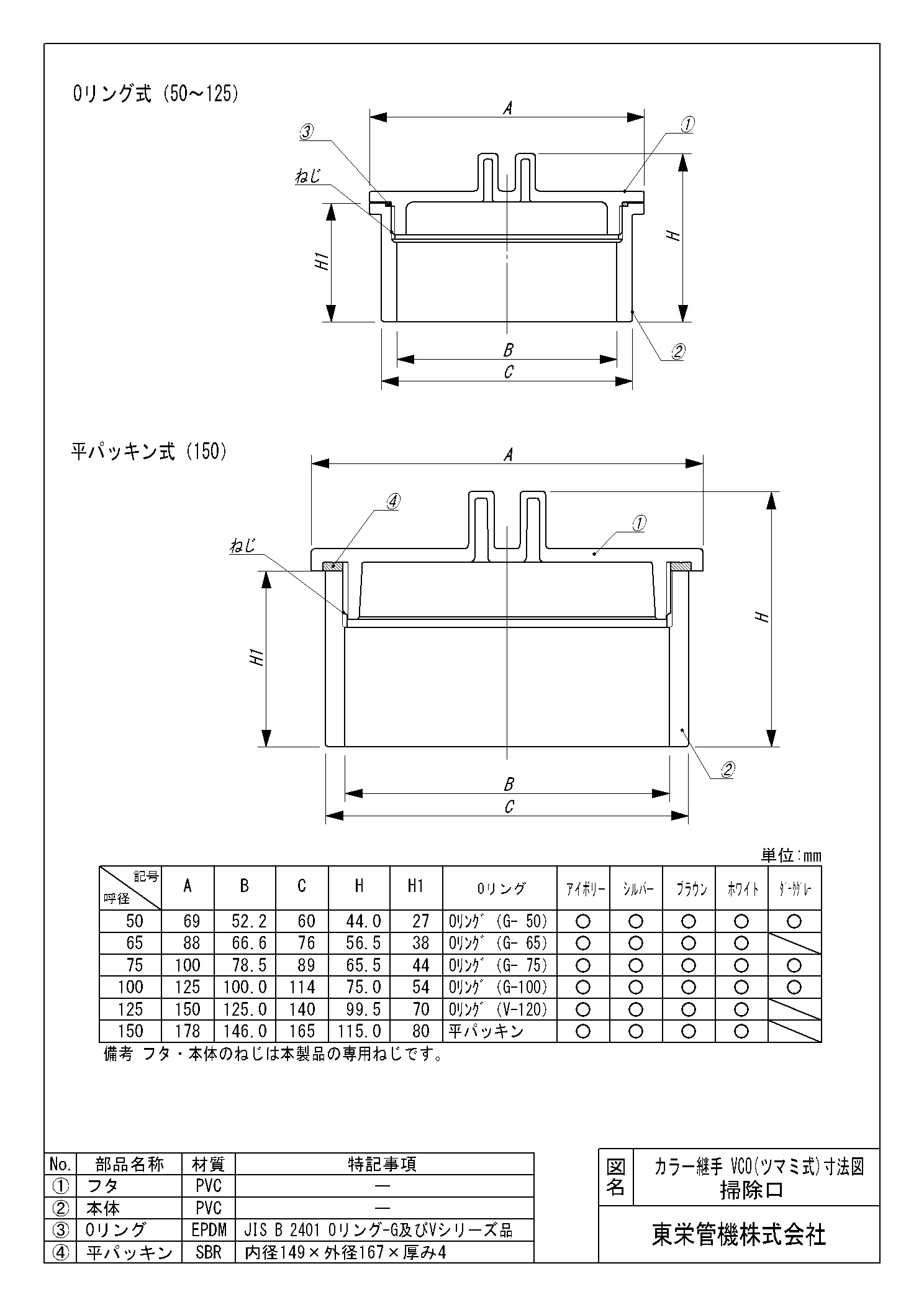 カラー継手(シルバー) 掃除口(ツマミ式)
